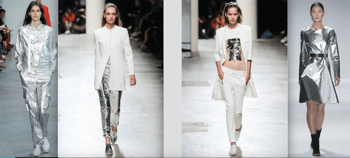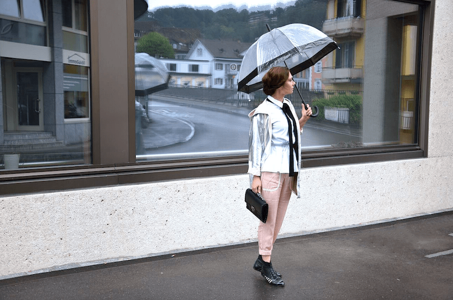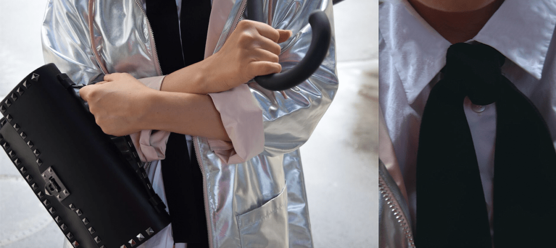 Я бы не стала надевать все серебристое сразу: даже на оконном стекле видны различные пятна и их многочисленные нюансы. Надену только одну «металлическую» вещь — например, парку.