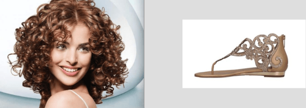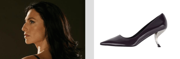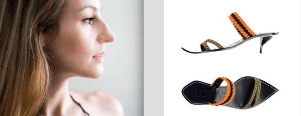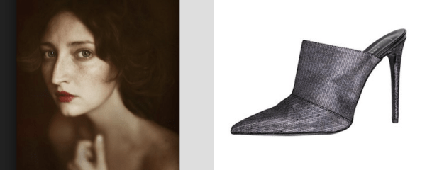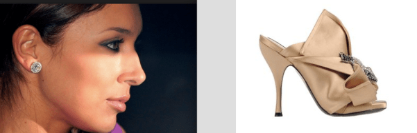 Обратите внимание, как выстраивается бровь: прямо и уверенно… а потом — падает резко.. Так же как и подьем туфельки, переходящий в подошву. Пухлые и упругие губы как упругие складки на обуви. Мягкая горбинка носа вторит форме каблука.