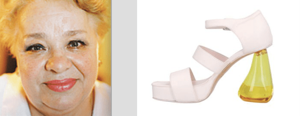 Крупные черты лица как крупные детали обуви. Расширяющийся к низу нос как форма каблука. Двойной подбородок как платформа туфельки. Наполненный жидкостью каблук как подтверждение веселого нрава и смешливого характера.