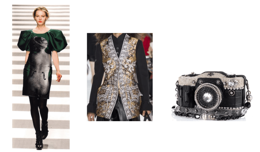 Платье с крупным экстравагантным принтом можно стилистически усилить при помощи крупного жилета с таким же экстравагантным и впечатляющим узором, а так же сумочки в виде фотоаппарата.