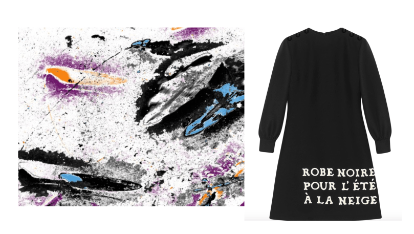 Представьте себе, что вы видите пальто в принт космического хаоса. А под ним — платье, выражающее порядок и некоторую стабильность. Принт в виде надписей напоминает нам: «В начале было Слово!»