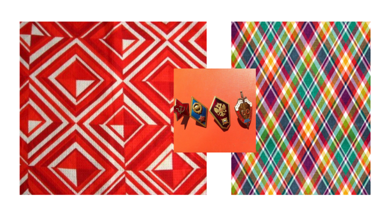 Мы видим, что первый принт — это оптическая иллюзия, которая призвана создать объемный эффект. Второй — это плоскостной принт. По своей природе — это ромбы. Усилить родственное впечатление помогут выпуклые значки или угловатые броши.