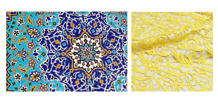 Восточный принт имеет, непременно, «воздух». Темные части принта сочетаются со светлыми. В компаньоны к нему мы берем кружевное полотно с таким же характером линий.