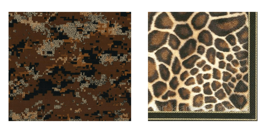 Перед нами один принт абстрактный, другой — анималистичный (шкурка жирафа). Отлично смотреться они будут по причине одного вида контраста — контраста насыщенности и резкости.