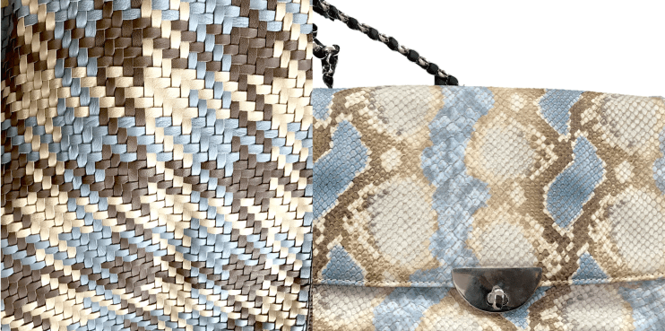 Если вы внимательно посмотрите, то непременно увидите, как плетения на ткани напоминают фактуру шкуры рептилии в сумке. Ромбики. Квадратики. Размытые формы.